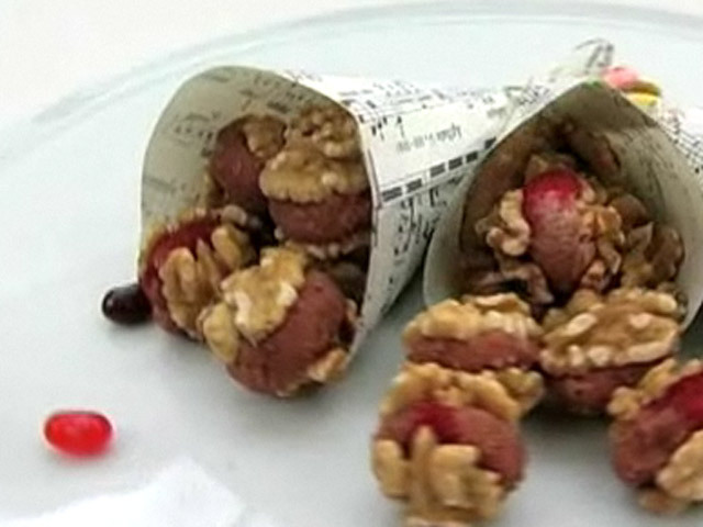 Вкусный десерт из грецких орехов.Состав:грецкие орехи, миндаль, клубника, вода, тросниковый сахар, корица.