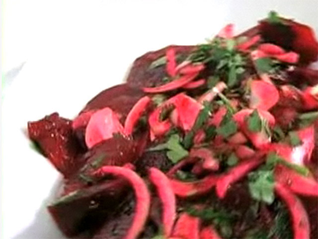 Рецепт марокканской кухни.На 2 порции:свекла — 3 штуки;петрушка — 1 пучок;лук — 2 штуки;тмин — 1/2 чайной ложки;масло — 3 столовых ложки;уксус — 1 столовая ложка;черный перец, соль.